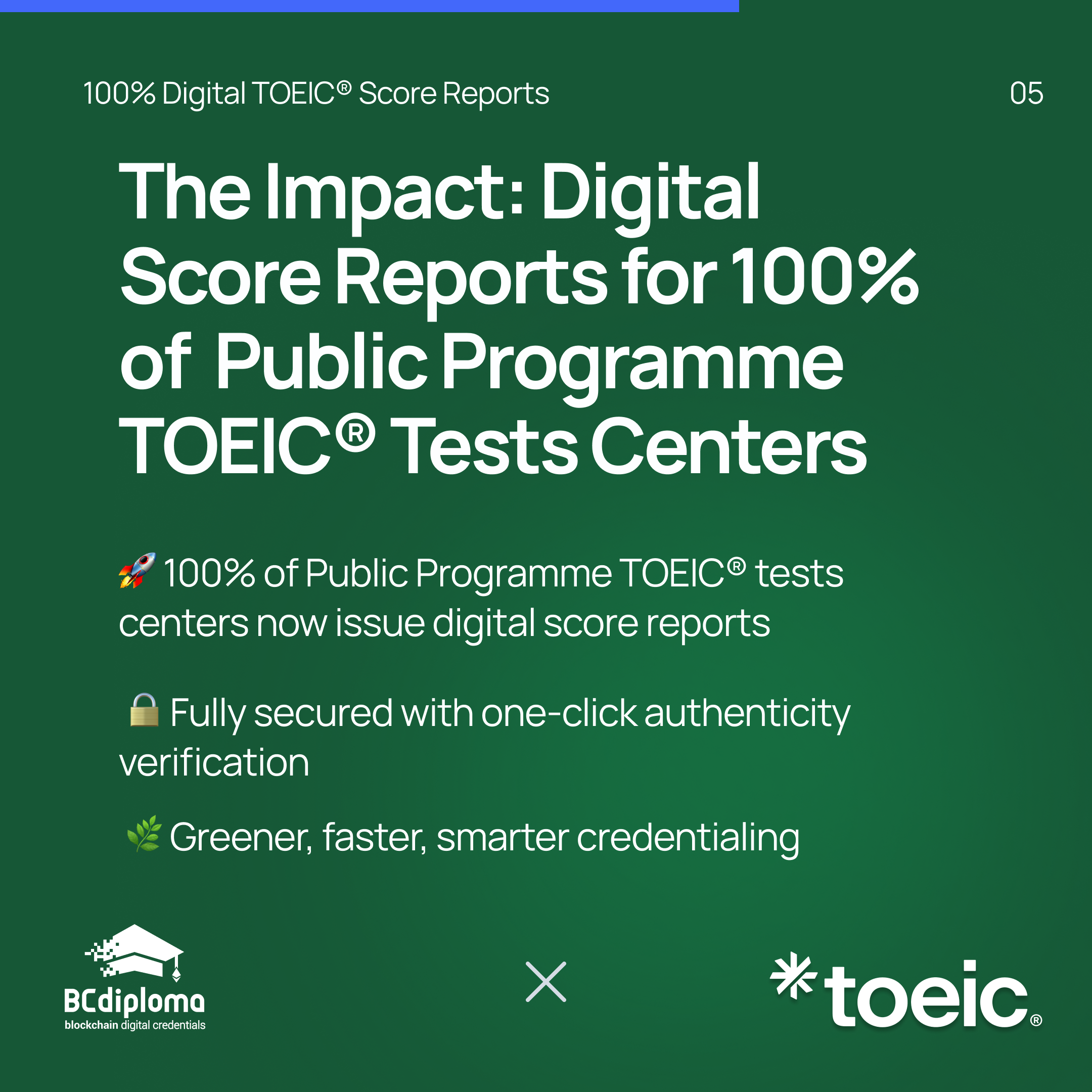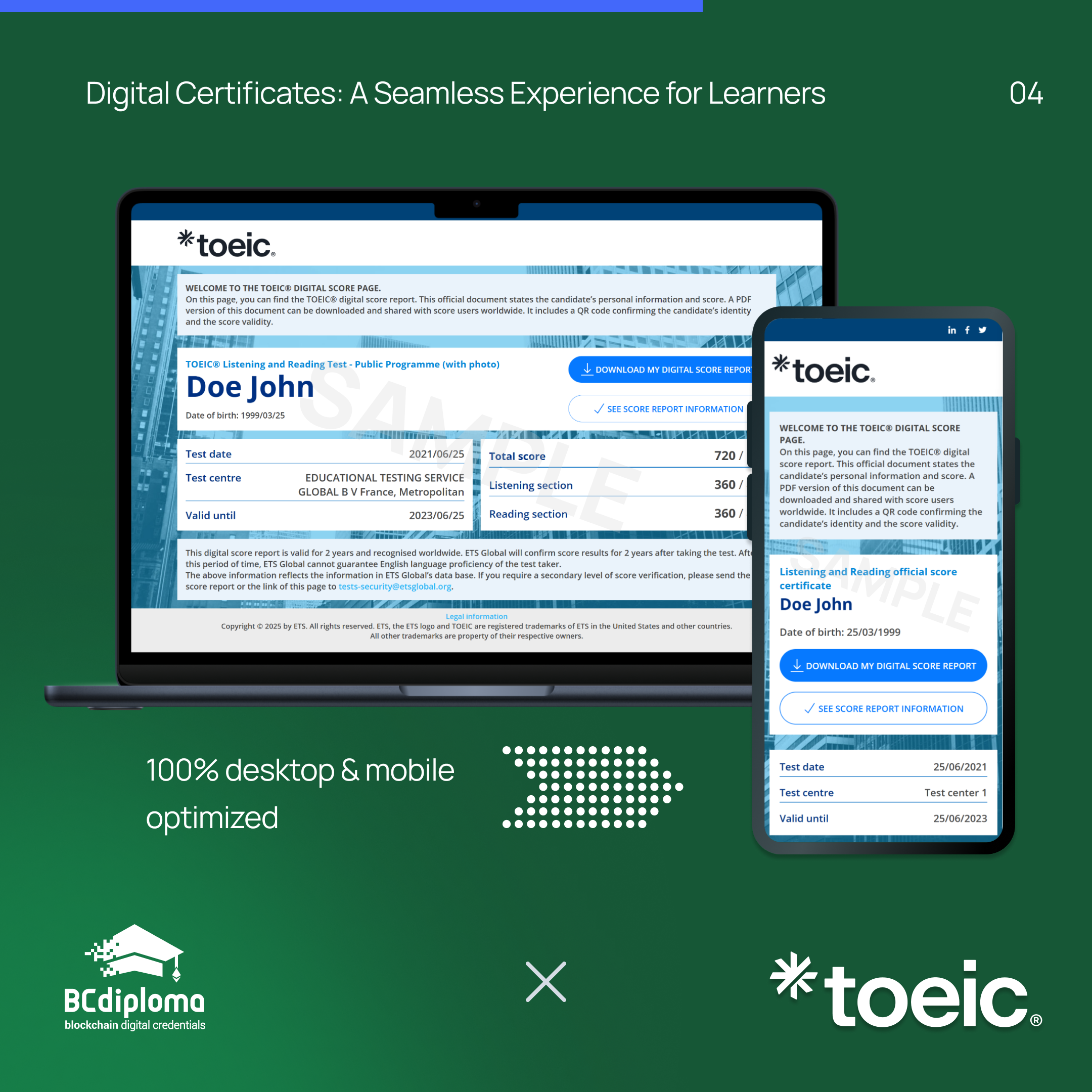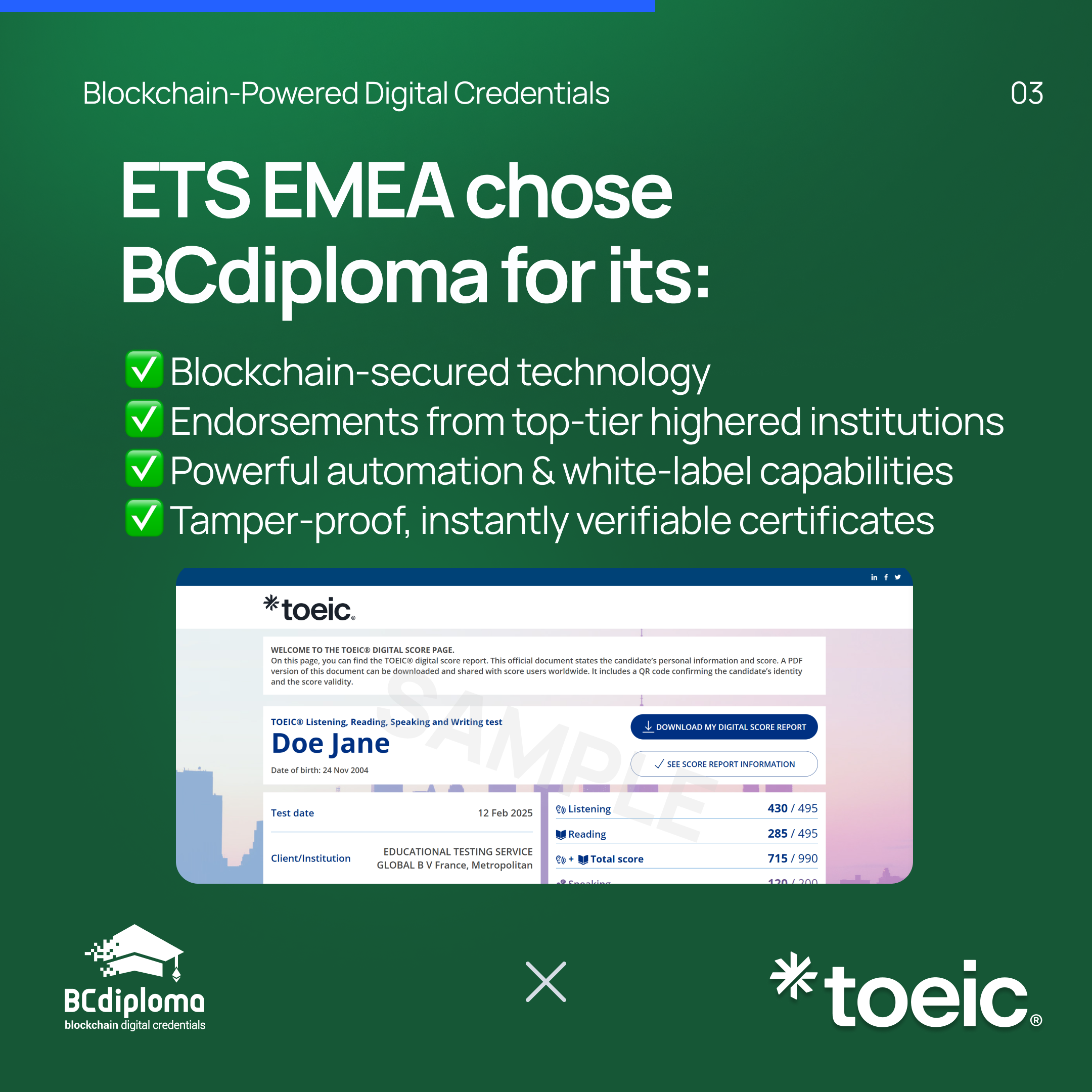 ETS Global, the certification body offering the TOEIC® English tests, has enabled candidates to receive their score via a dematerialized certificate since 2021. In 2025, the milestone of 500,000 digital TOEIC® score certificates issued via BCdiploma was surpassed, and this innovative digital version is now used by all TOEIC® test centers in the Public Program. This technological evolution is part of a desire to improve the candidate experience by evolving the paper certificate into a secure, digital service.
