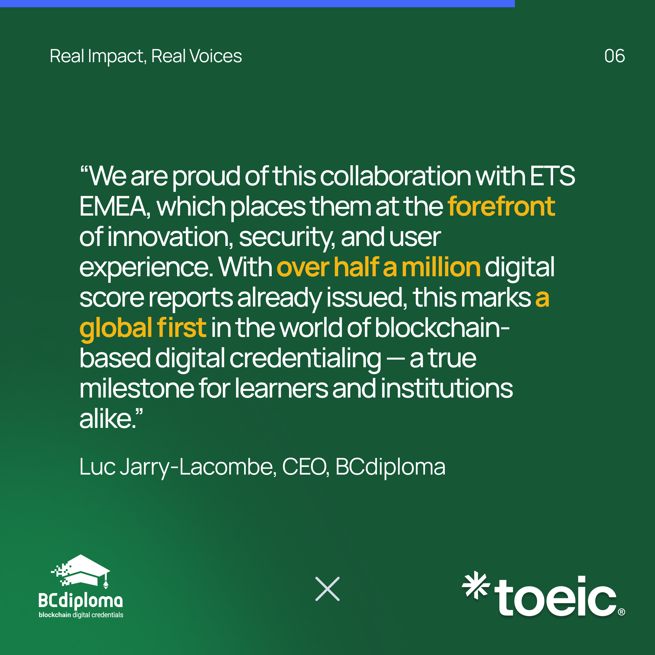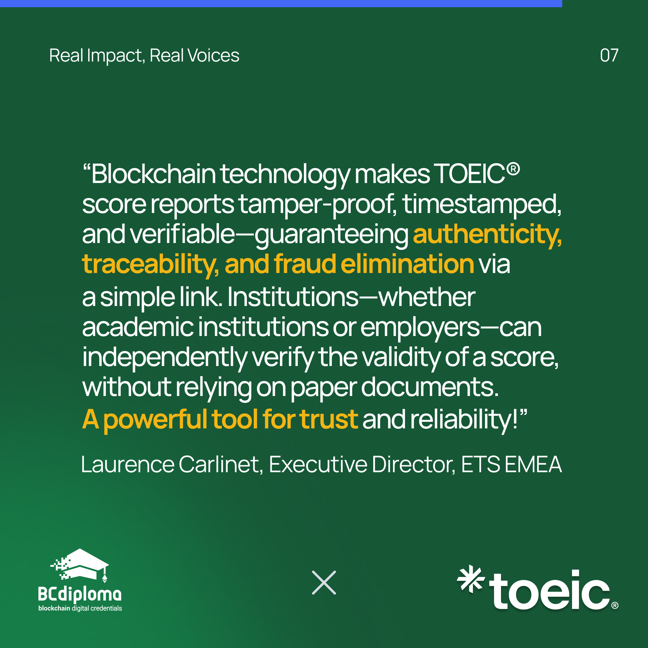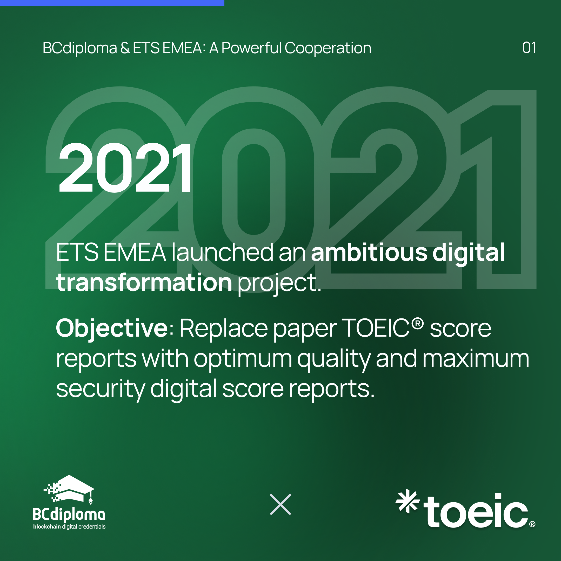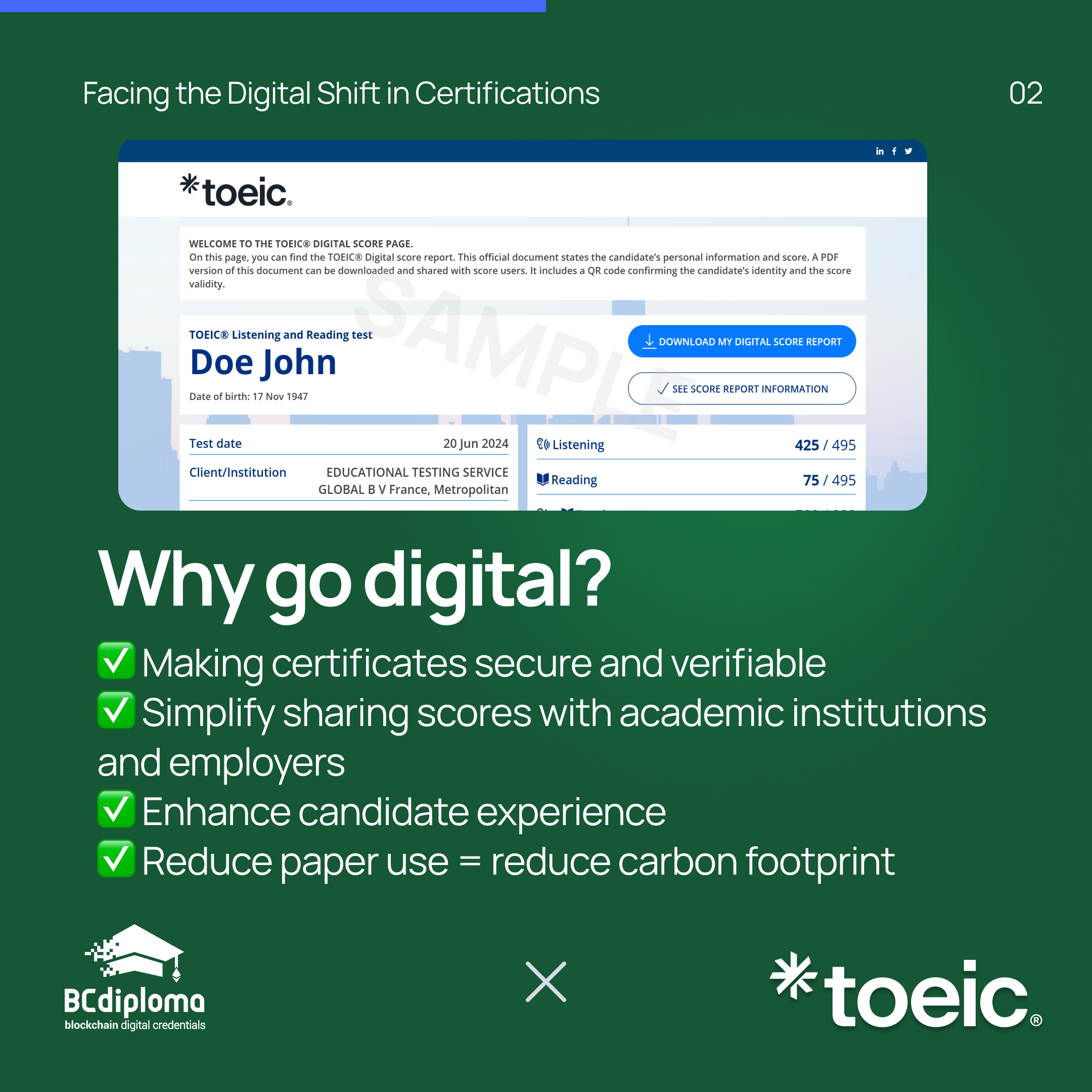 ETS Global, the certification body offering the TOEIC® English tests, has enabled candidates to receive their score via a dematerialized certificate since 2021. In 2025, the milestone of 500,000 digital TOEIC® score certificates issued via BCdiploma was surpassed, and this innovative digital version is now used by all TOEIC® test centers in the Public Program. This technological evolution is part of a desire to improve the candidate experience by evolving the paper certificate into a secure, digital service.
